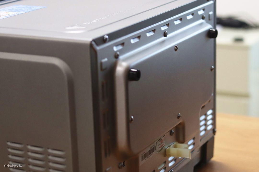很多蒸烤箱都会设置一个“排气口”,使用过程中会有蒸气排出。这台格兰仕微蒸烤一体机则取消了排气口设计,在背部做了一个用于冷却蒸气的冷凝器。