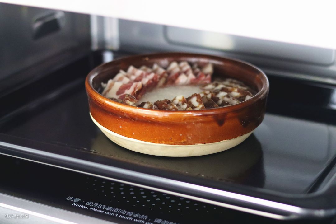 腊肠和腊肉切好之后直接均匀地码放在米饭上,即可送入微蒸烤箱料理。我们选用100℃蒸气模式,蒸30分钟。