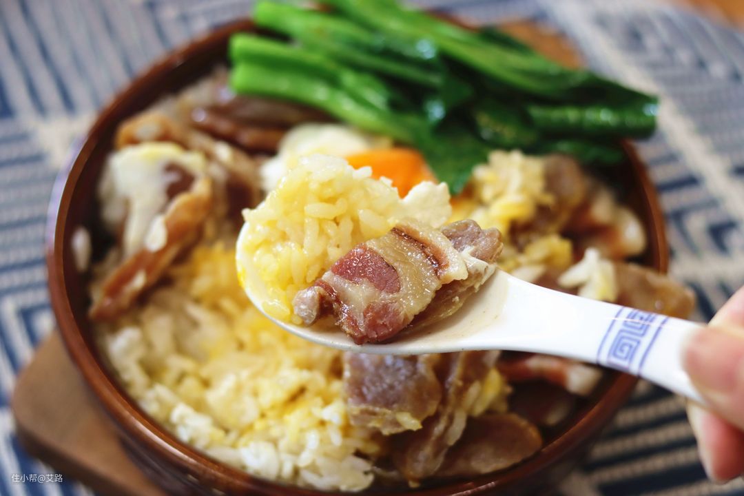 最后,码上青菜,淋上一圈调制好的煲仔饭专用酱油,一钵热腾腾的窝蛋腊味饭就完成啦~