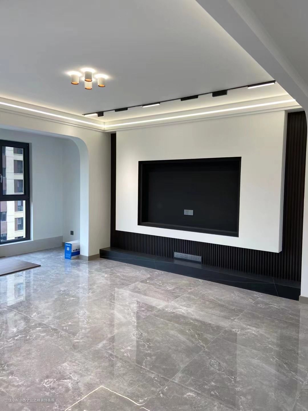 客厅所有门垛和梁的位置统一做成弧形,弱化菱角的同时也将整个客厅的颜值拔高了一个档次。电视背景墙采用石膏板悬空设计,底部是木格栅做了装饰,搭配上大理石台面的地台,整个背景墙十分简洁美观!