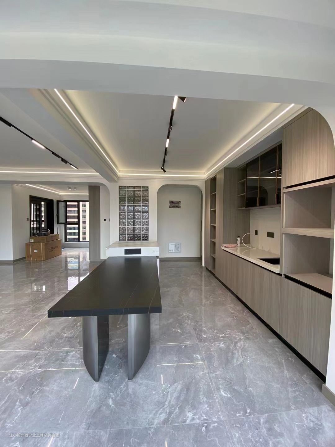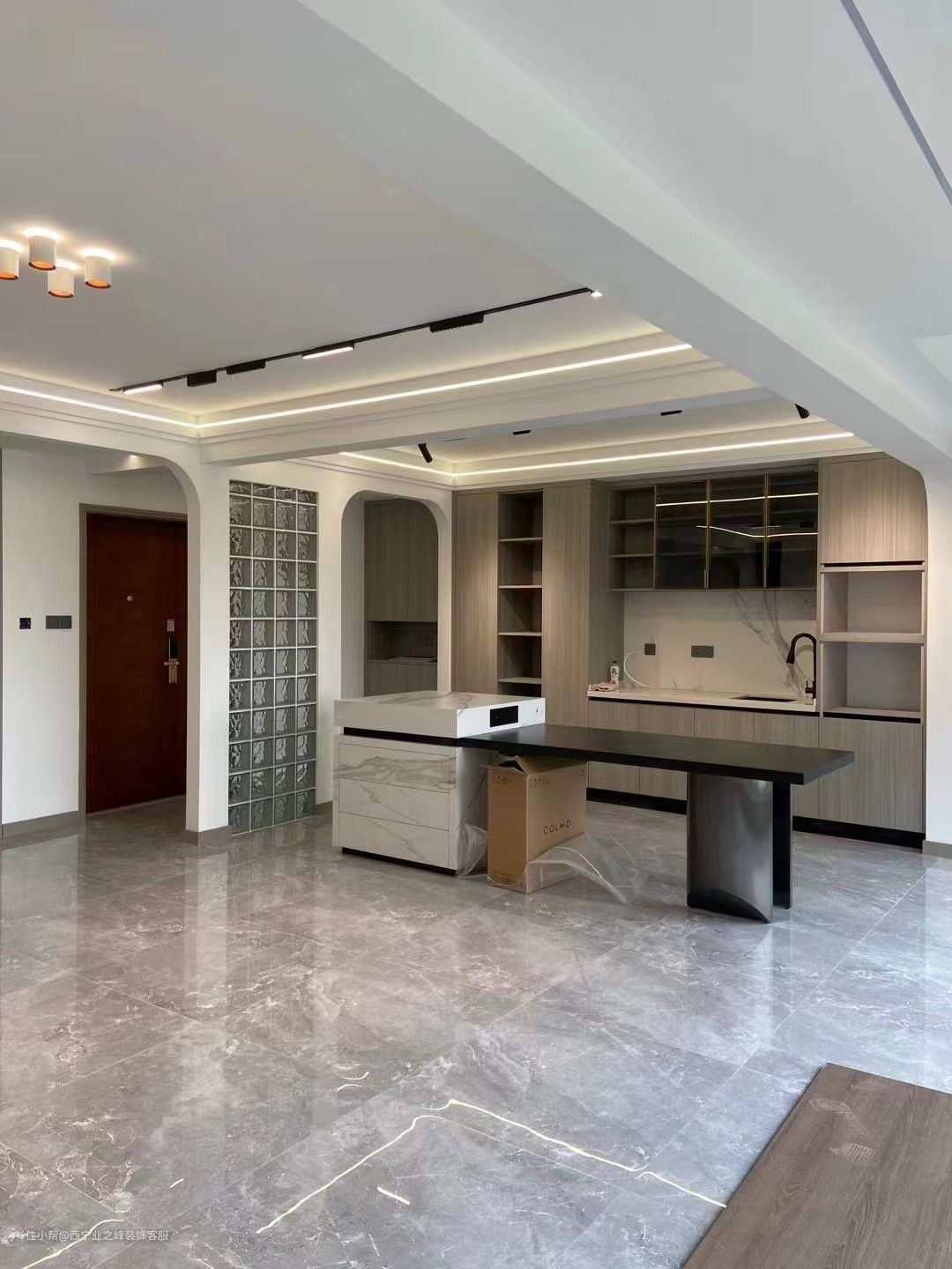 本案位于西宁市城北区,是一套四室两厅两卫的户型,业主比较倾向于现代风格,经过与设计师的多次商榷,最终将主卧拆除变成三室两厅两卫的户型,在视觉上客餐厅的空间明显扩大了许多,在客厅增加了一个中岛台的设计,岛台之所以吸睛,是因为它打破了常规的设计结构,将原本属于酒吧、咖啡厅或者别墅中的吧台设计带入到日常生活中,给人一种时尚、新鲜的视觉冲击力。