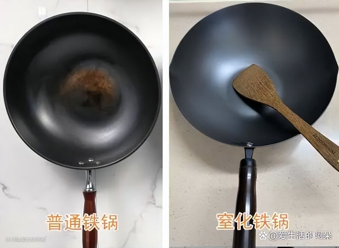 同样铁锅里面也分为普通铁锅还有室化铁锅,“渗氮”防腐工艺的「窒化熟铁炒锅」,不仅增加了防粘和防锈的物理特性,同时也减少了油烟,日常使用也不需要特别的养护,洗完之后不需要烘干也不需要担心生锈的问题了。