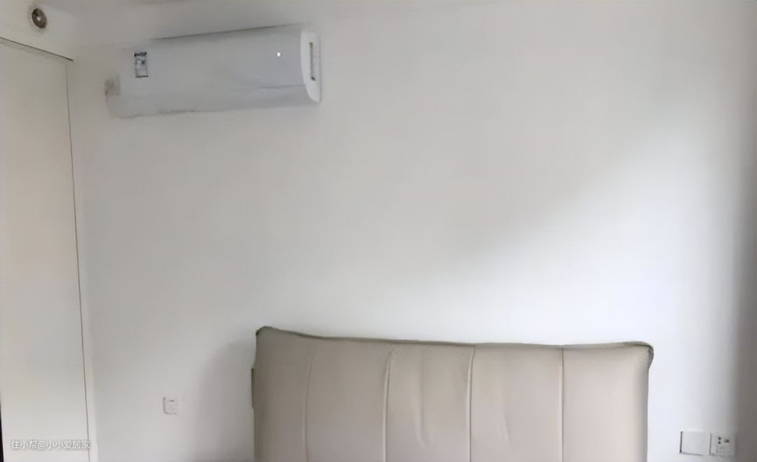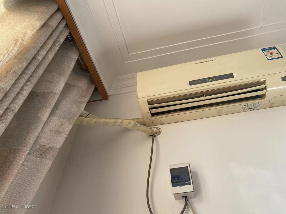 图上为一个家庭常见挂机空调安装后的样子,外露出了一截长长的管道以及电源插座,电源线的隐藏相对困难,不过我们可以利用窗帘盒以及定制柜子的位置,将穿越出去的管道进行进一步的隐藏,不过这里需要注意的是空调管道相对较硬,穿洞的时候要注意朝向问题。