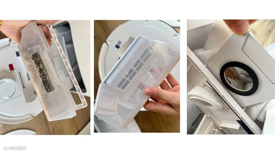 尘盒有三层过滤材质,分别是初滤、海绵、HEPA滤网。能过滤掉颗粒物、灰尘、细小微尘,拦截概率可以达99%。尘盒是从侧面开关,倾倒比较方便,不会卡住毛发。