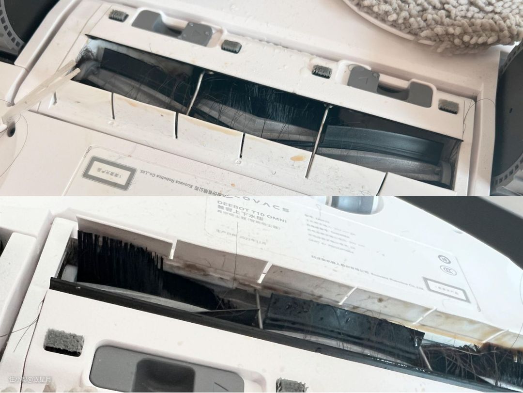 前面测试完拖地功能之后,可以看到主刷和边刷被湿垃圾污染到了,不过这是任何一款扫地机器人都无法避免的。不过主刷罩前面有个挡板,挡板的长度也比较长,很多湿污渍会被粘在挡板上,对主刷的影响比较小。这样的残留污渍就需要自己手动擦拭一下了。