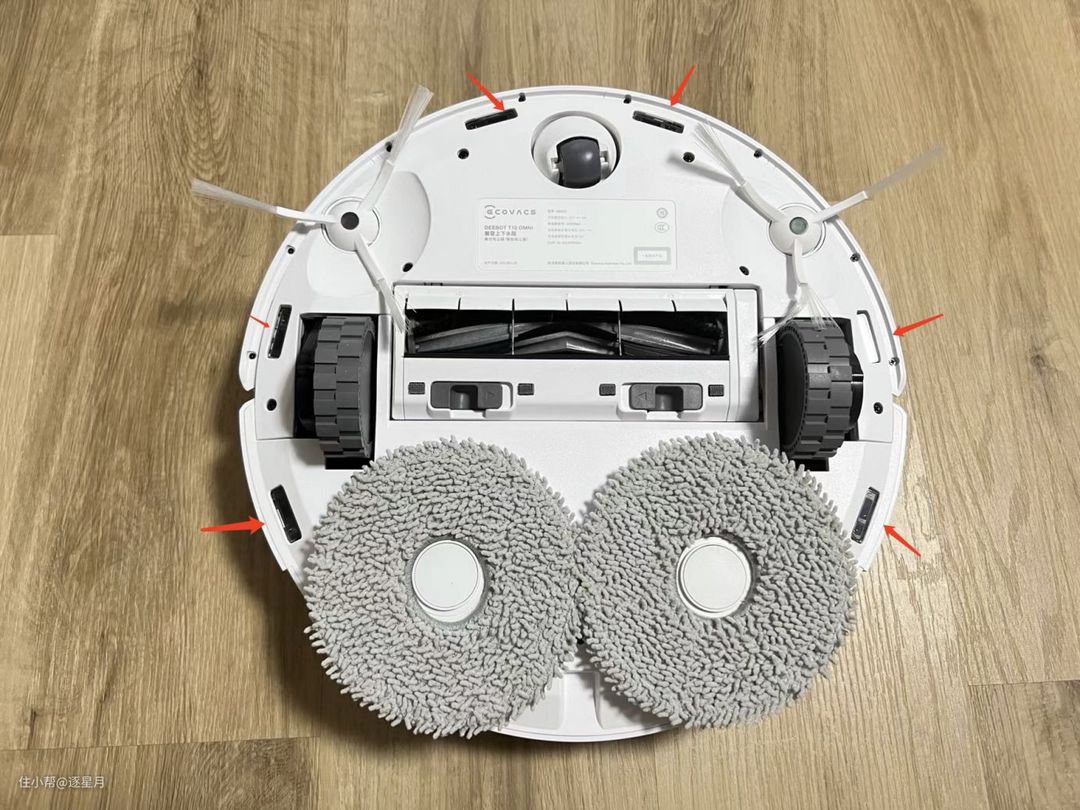 机器人的背面和T10 TURBO一样是有6组防跌落传感器。但是这款OMNI少了地毯超声波传感器,如果清洁地毯就需要单独设置禁区或者开启单扫模式。