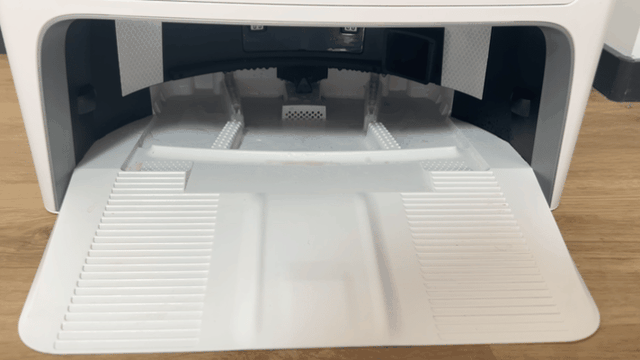 在基站中间是扫地机器人的集尘仓,按下按钮,集尘仓就会弹出。这个集尘袋有3L的容量,可以2-3个月不用倒尘盒还是很方便的。