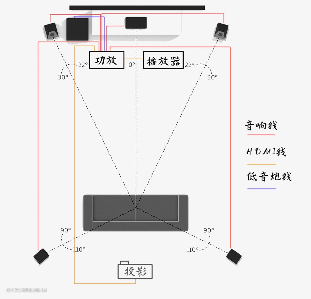 传统音响:安装方式来说,确实很复杂,没有专业朋友或者公司帮助的话,很容易做错,里面要注意的点很多,而且还需要预埋2根HDMI线(一根使用一根备用)和多根音响线。要不花钱找专业人士弄,要么自己能折腾,喜欢研究。要不想弄出来一套不错的影院系统真的是难上加难,如下图所示。