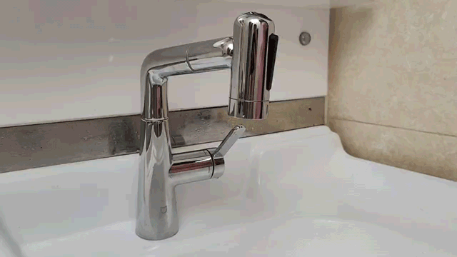 并且龙头内设置了35cm长的高密度尼龙软管,轻轻一拽就能把龙头覆盖到整个面盆的范围。