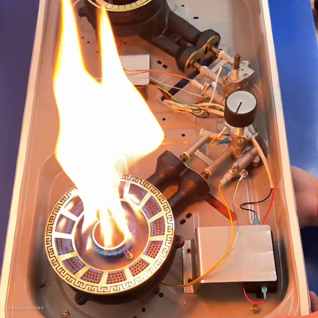 通过云鹏的调节操作,大家已经看到已经变成蓝色的火焰了,这样火焰就正常的,它的燃烧效果也是非常的棒。我把灯关暗一点,大家可以更加欣赏改装好的效果。一点就着,点火非常漂亮而且非常灵敏。然后我们看一下另一边120的。这个保洁款,最蓝色的火焰是不是长的距离距离距离远达简单的漂亮。改装好的效果已经呈现给大家了。以后家里的燃气灶生锈比较严重,又不想把它扔掉,可以像云鹏这样换一个炉头和一个火盖,就可以让燃气灶变成一台新的。并且再用10年都不是任何问题。