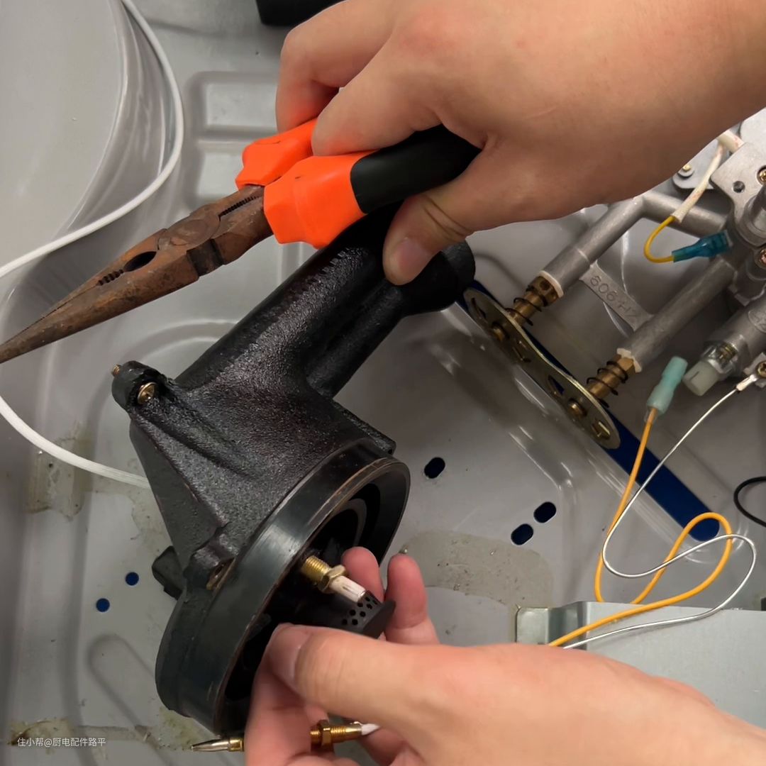 我们开始动手把它装上去,这些针我也建议大家换掉,长时间使用上面容易积碳,而且打火和感应的效果都不是很好,把它取下来就可以了。像这种热电偶的感应针,直接用手把它拉住往外扯用力用力扯,不要把它不要怕把它扯坏了,把这个地线给它取掉就可以了。然后打火针在脉冲上面,直接也是一样的把它扯下来,再把新的针给它装回去。怎么拆的就怎么装还是很简单的。这个螺母我就建议大家直接用手把它拧紧就可以了。因为如果你用扳手拧,后期要检修的时候,这个螺丝生锈在上面,那就很难拆的。这样拧上去,这个针不掉下去可以了,有一点晃动也没有任何问题。对准气孔插进去,把炉头底部的三个螺丝给它拧上去,把炉头固定住就可以了。