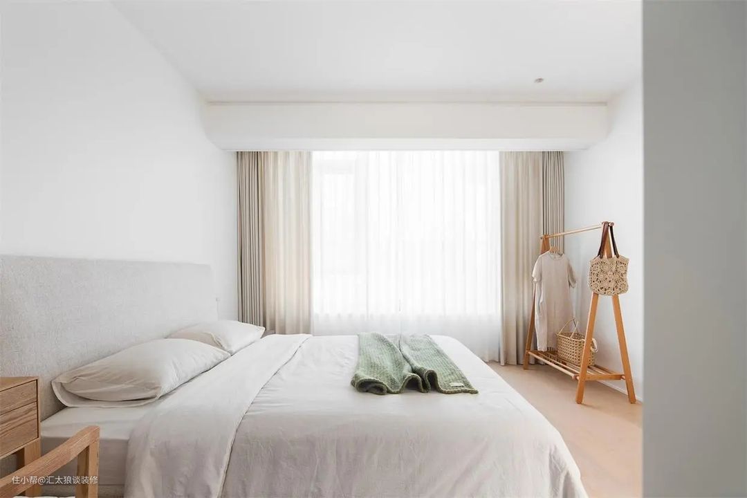 主卧里面也没有特别花哨的装饰陈设,连床头靠背都是极浅极浅的色调,一眼看过去,整个空间由白色与木色铺设而成,将室内氛围渲染得恬淡温暖极了。因为主卧内配有单独的衣帽间,所以室内就只安排了一个简易的衣架,用来挂放睡前换下的衣服。