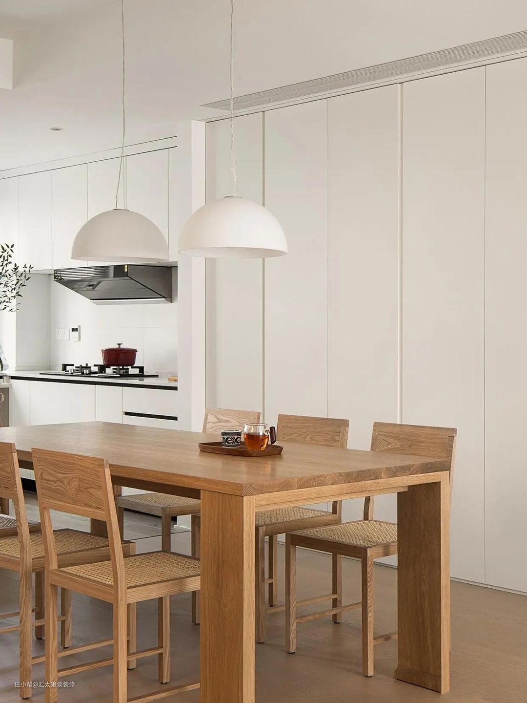 餐厅这边安排了一张2米长的餐桌,两边各摆放了三把椅子,大小刚刚好。餐桌椅统一采用的橡木材质,色泽自然,质感温暖,搭配两盏日式吊灯,有暖黄的灯光烘托着,整个就餐区的氛围显得温馨极了。