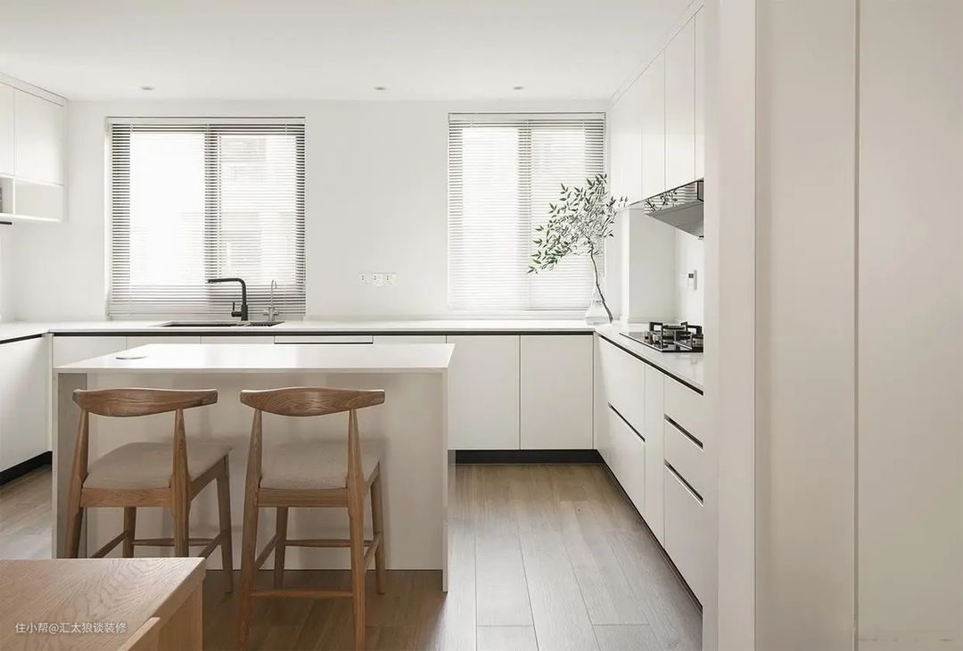 厨房的隔墙拆掉后,不仅视觉上显敞亮了,空间也显得宽裕了许多,所以厨房里面除了定制U形橱柜外,还可以再安排一个岛台。平时,一家人可以围坐在岛台前吃早餐、喝下午茶,或是一起包饺子、做烘焙。这样,厨房就不再是一个孤立的存在,而是一个可以拉近距离、凝聚家庭的空间。