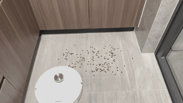 猫粮测试:使用成年猫猫粮测试S20 Pro对于重颗粒的清洁能力,由于边刷的速度快依然有甩飞垃圾的情况,但追觅的吸力及滚刷能力表现不错,最终剩余3粒猫粮未被清理,也没中途漏垃圾的情况出现。
