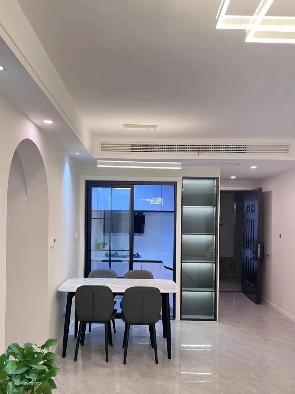 餐厅地面选用了高级经典的顺辉瓷砖·岩板「菲拉格慕」,深灰色的基底上,45°的带状大理石纹和深灰色石材裂纹倾斜而过,将大自然的鬼斧神工及恢弘的气质展现得淋漓尽致;750×1500mm大规格配合6面设计,仿佛山川绵延而下,整体铺贴更加大气磅礴。纹路极速而不夸张,白色自然渗入灰底,给人和谐自然舒适之感,带来高级优雅的视觉体验。