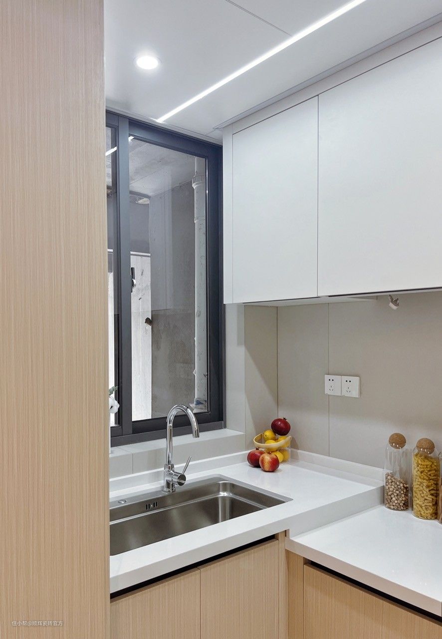 厨房墙面使用的是顺辉瓷砖·岩板「霓虹甜心-淡奶油」,奶白色透着微微的淡黄,温而不腻,顺滑的表面具备高级感,温柔淡雅十分治愈。