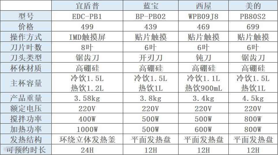 看来看去最后挑出这四款破壁机,先来看看这几款最基础的参数对比: