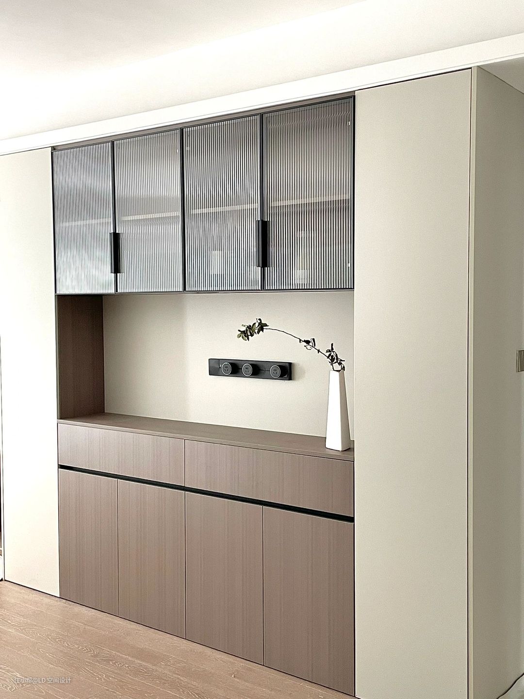 首先第一种,餐边柜鞋柜一体设计,这是针对很多中间户型的设计,进门就是餐厅的设计,为了节省空间,进门右手边做了底面,跟中间镂空的鞋柜设计,转角过来就是餐边柜的设计,为了空间感更好点,餐边柜的镂空区域没有做侧板,并且做了圆弧设计,镂空的区域也比较大,70公分,并放置了直饮机。