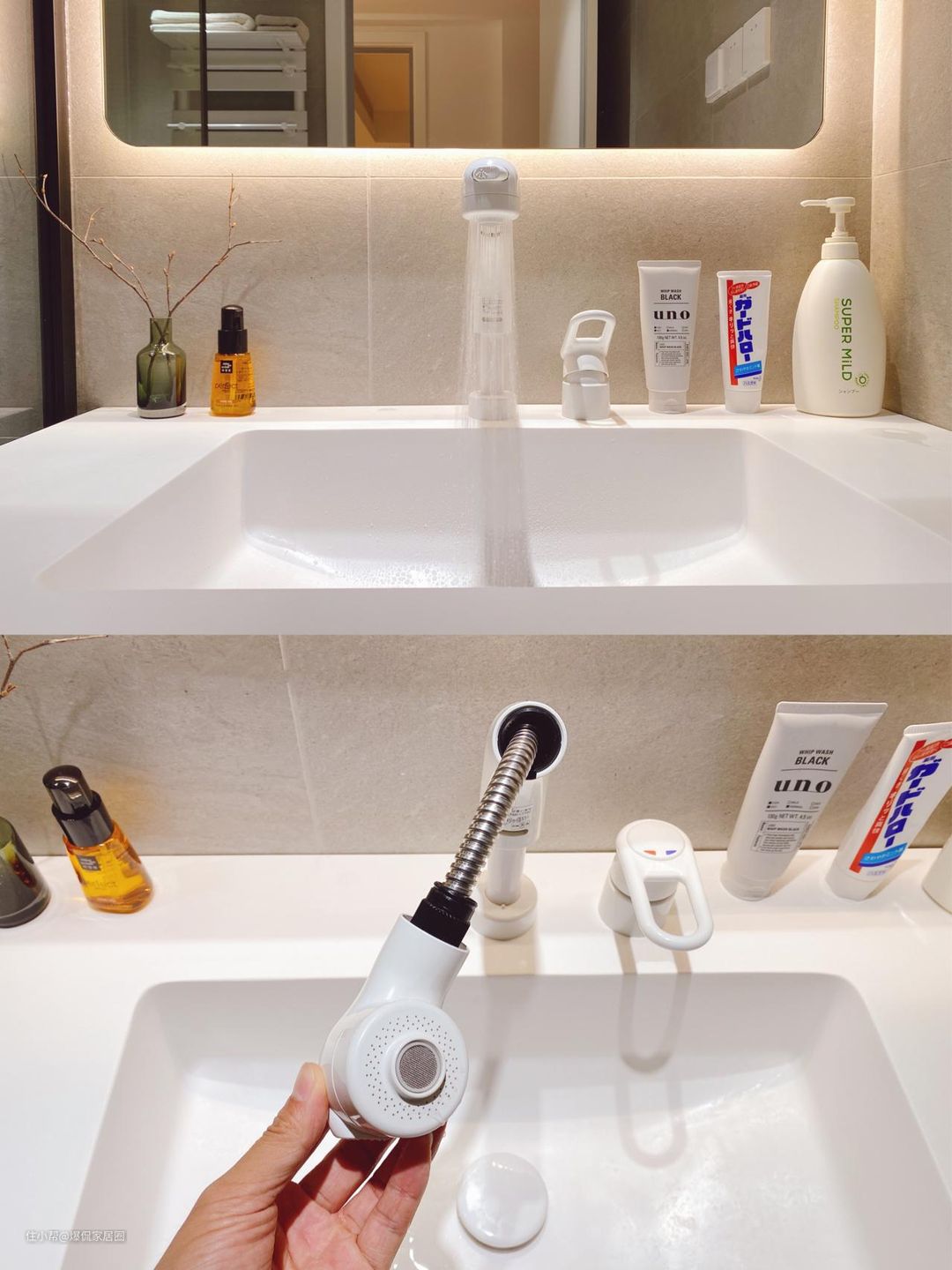 建议换成双模式出水的抽拉式水龙头,整个水龙头可以拉出来,还可以切换气泡水和花洒水两种模式,拉出来时用来洗头或冲洗面盆非常方便。