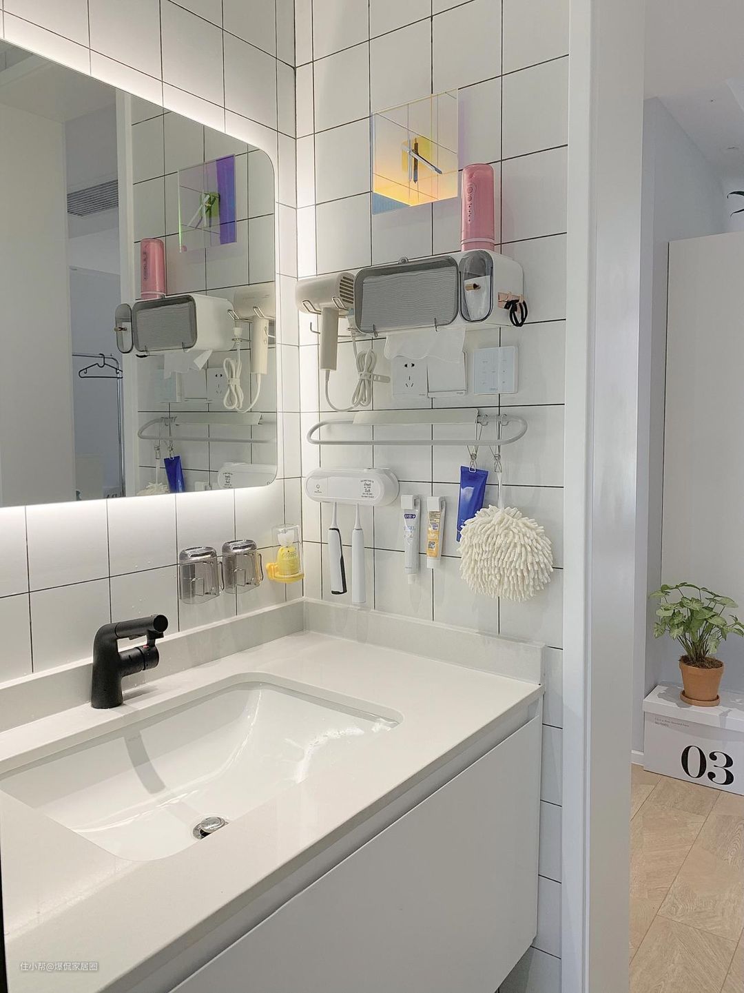 卫生间洗漱,其实一家三口有不少东西,怎么收纳是一个问题,全部放在台面上会显得很凌乱,而带柜子收纳功能的浴室镜就实用很多,尤其是小户型卫生间。