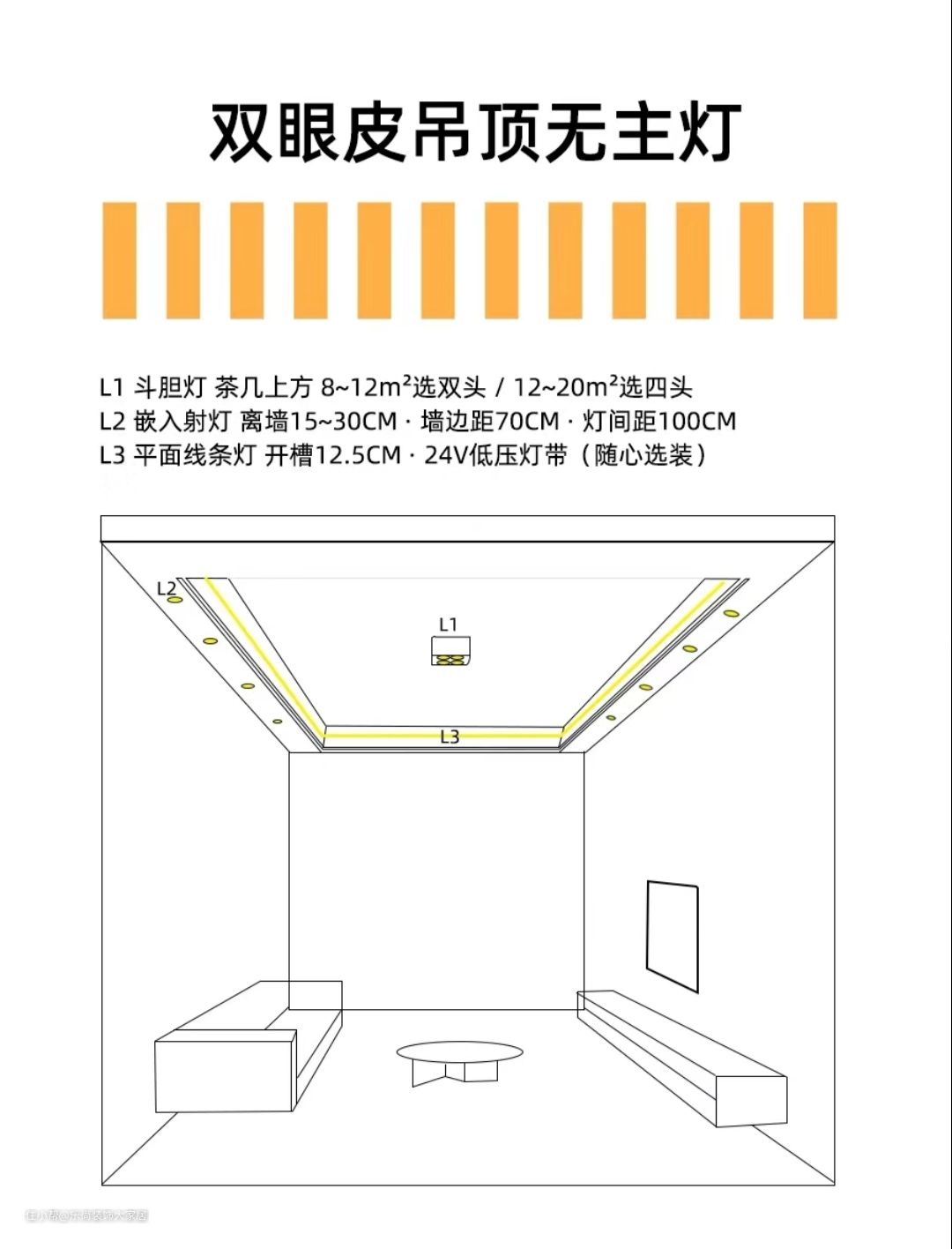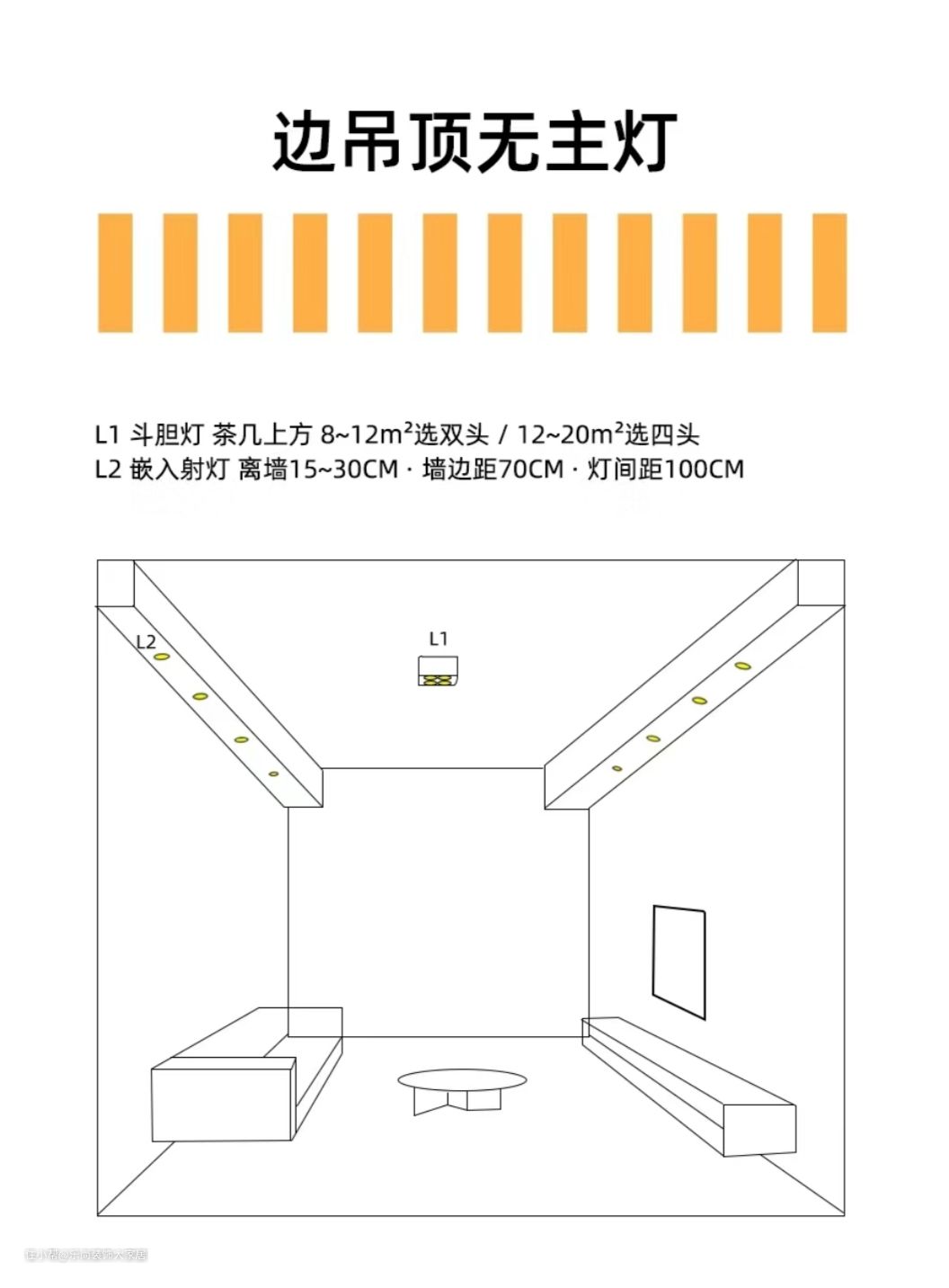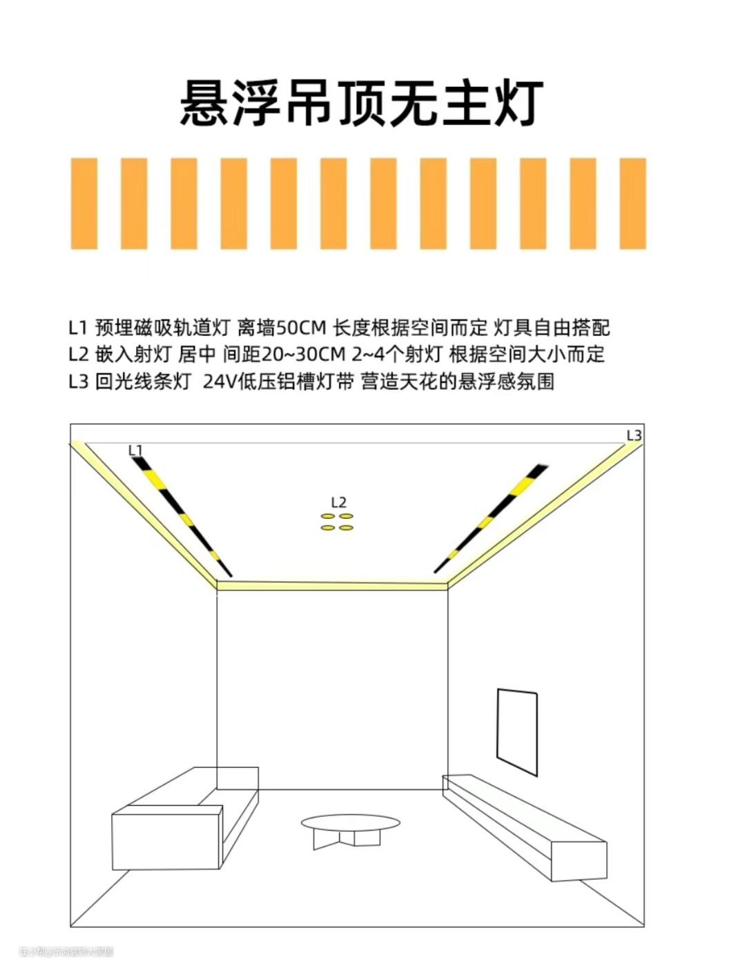 - 层高<2.7m:不吊顶布灯,可以直接做明装灯带或者吊个简单的主灯;