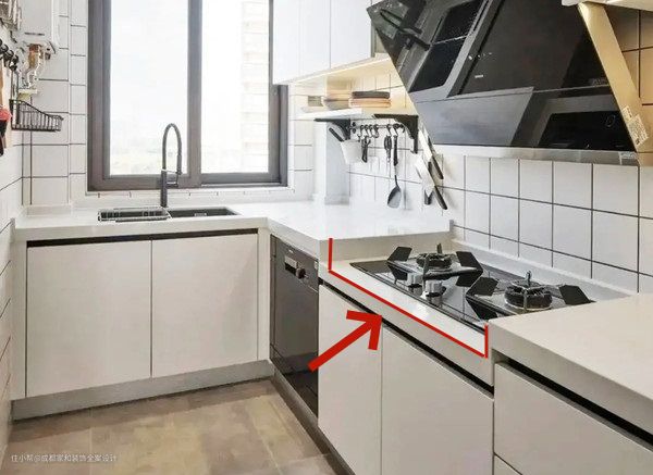 上图中的高低台也许是比较理想的状态,但是这样的“凹”字型布局不够美观,而且灶台两侧挨着的台面容易被火烤到,放稍微大一点的炒锅可能都放不下。