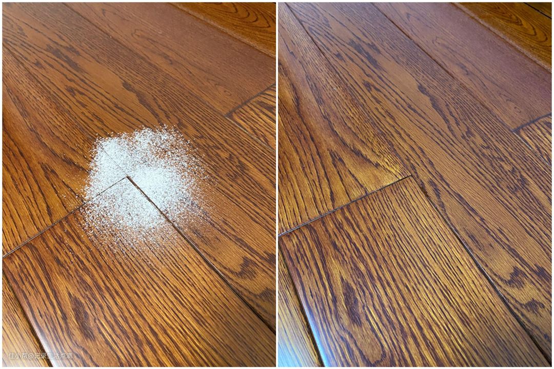 放大对比下清扫前后的地板,这次测试使用的是最大吸力档,清扫后地板表面甚至是缝隙里面没有看到面粉残留,可见6000Pa大吸力+胶毛一体滚刷的组合还是很强劲的。