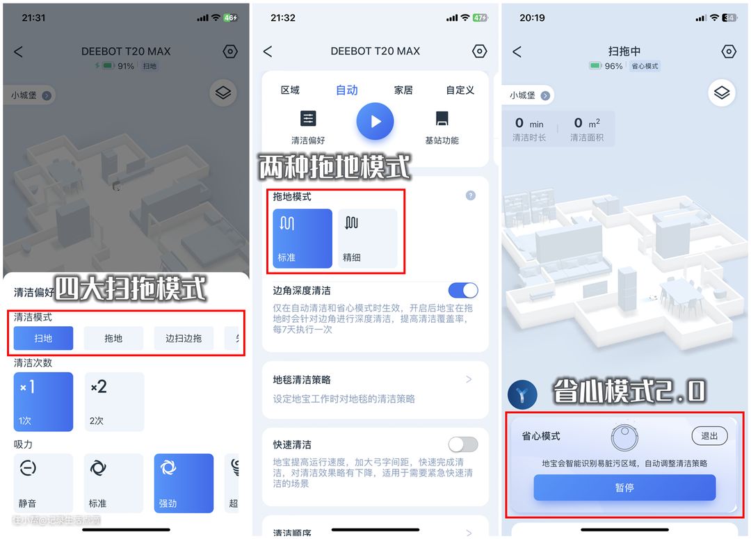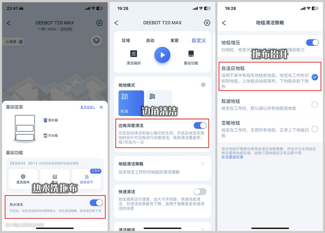 最后在温馨提醒下各位刚开始使用科沃斯T20 MAX的小伙伴,热水洗拖布、边角清洁、拖布抬升这三大功能都可以在App中设置,使用时记得开启,要不就白瞎了这些好用的功能了。