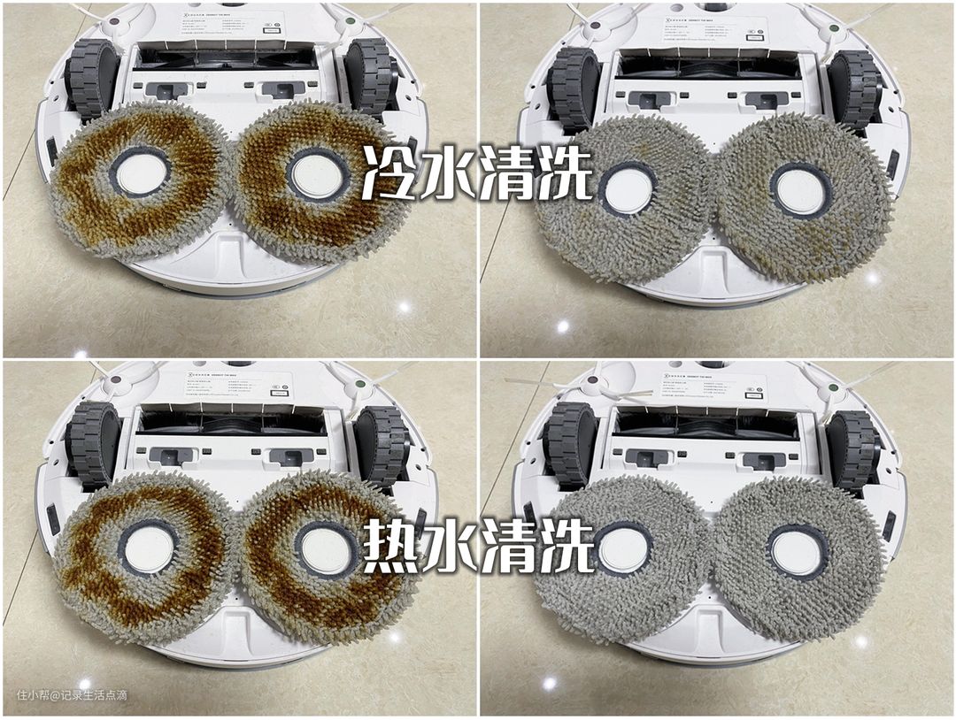科沃斯T20 MAX加入了全新的55℃黄金温度热水净洗功能,相比原来的冷水清洗,热水的清洗效果会更好,上图中的对比就很明显。拖布彻底洗干净了,地面自然也拖得更干净了。不管是洗衣机还是洗碗机,都会采用热水洗涤,原因很简单,就是热水可以洗得更干净,现在扫拖机器人也开启了热水洗拖布的新时代。