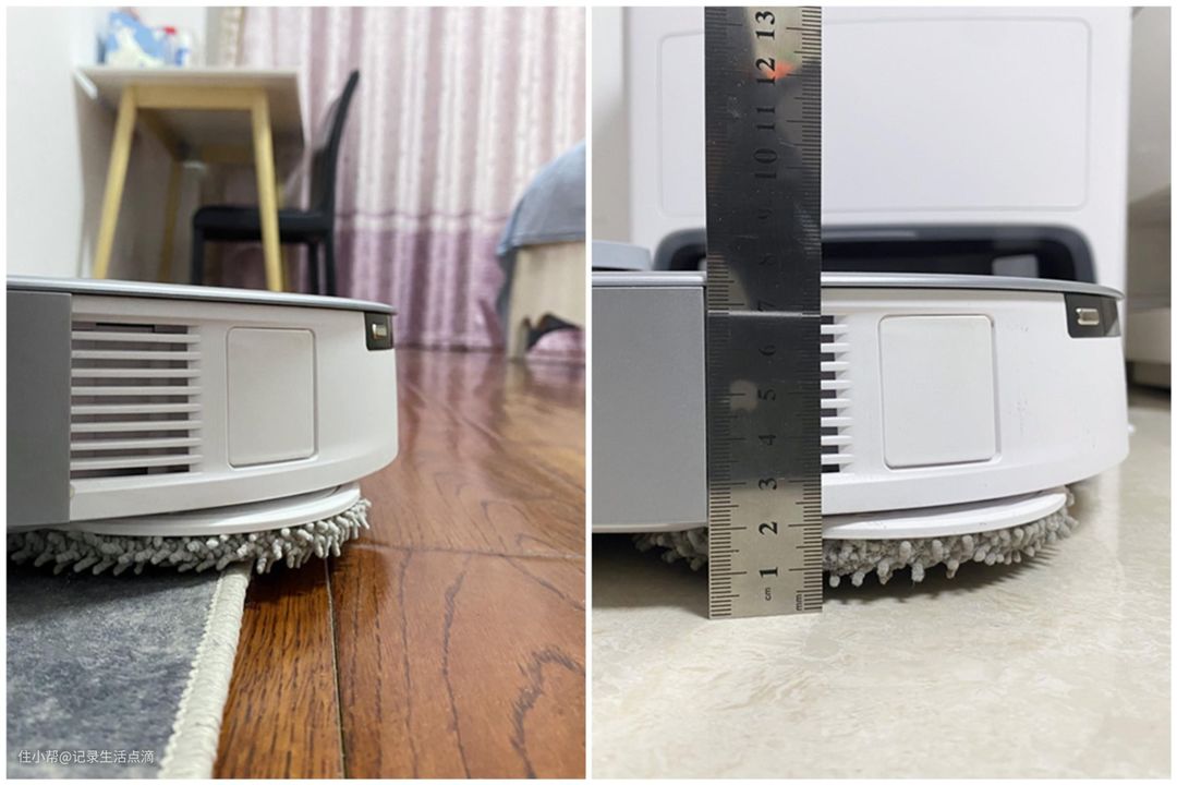 科沃斯T20 MAX底部有个地毯识别传感器,一旦爬到地毯上,拖布就会自动抬升,并停止旋转。测量了下拖布抬升后的高度,拖布表面离地差不多有1cm的距离。