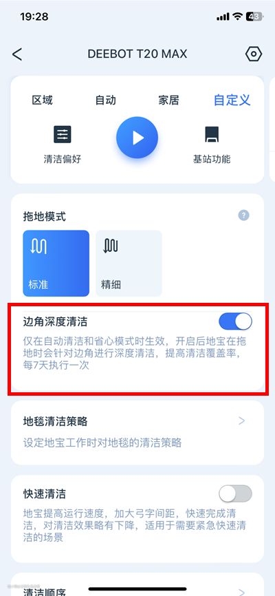 边角深度清洁会比较费时间,所以默认设置为每7天自动执行一次,这个边角深度清洁功能可以在App中选择是否开启。