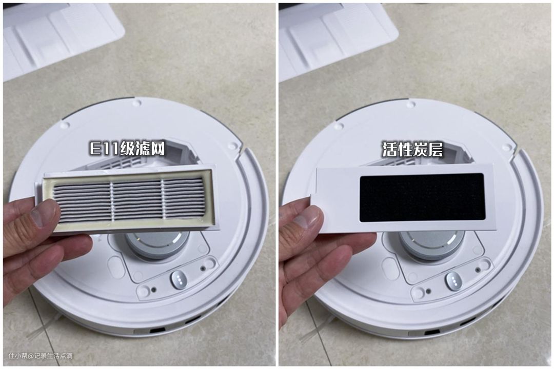 除了抗菌尘袋外,扫拖机器人的尘盒中也配置了抗菌滤芯,E11级滤网+活性炭的组合可以实现抗菌除异味的效果。抗菌滤芯和抗菌尘袋在风路上实现了全链路抗菌。