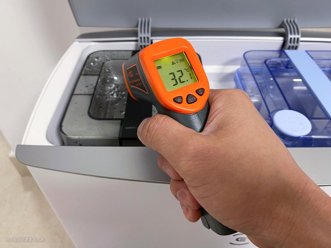 科沃斯T20 MAX热水清洗拖布的水温为55℃,这是针对各种污染物熔点而设定的一个恰到好处的温度,55℃正好可以溶解各种污染物而不会导致糊化。基站清洗拖布时,清水箱中的水会通过螺旋式加热管把水速热至55℃,然后注入清洗槽用来清洗拖布。清洗时的水温测不了,就测了下污水箱的水温,清洗后的污水被抽到污水箱后还有32℃多。