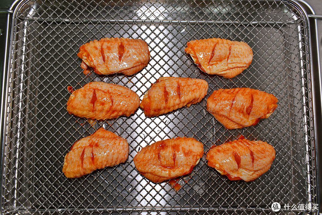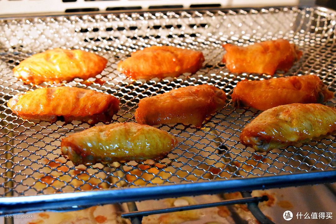 腌制好的鸡翅 直接放烤架上,用智能菜谱的“秘制鸡翅”功能,烤上20分钟就好了,温度、时间都不用自己考虑,太方便了。在烤翅过程中,我们可以通过可视的钢化玻璃窗观察鸡翅的色泽。大概13分钟时鸡肉表面的颜色就已经金黄了。