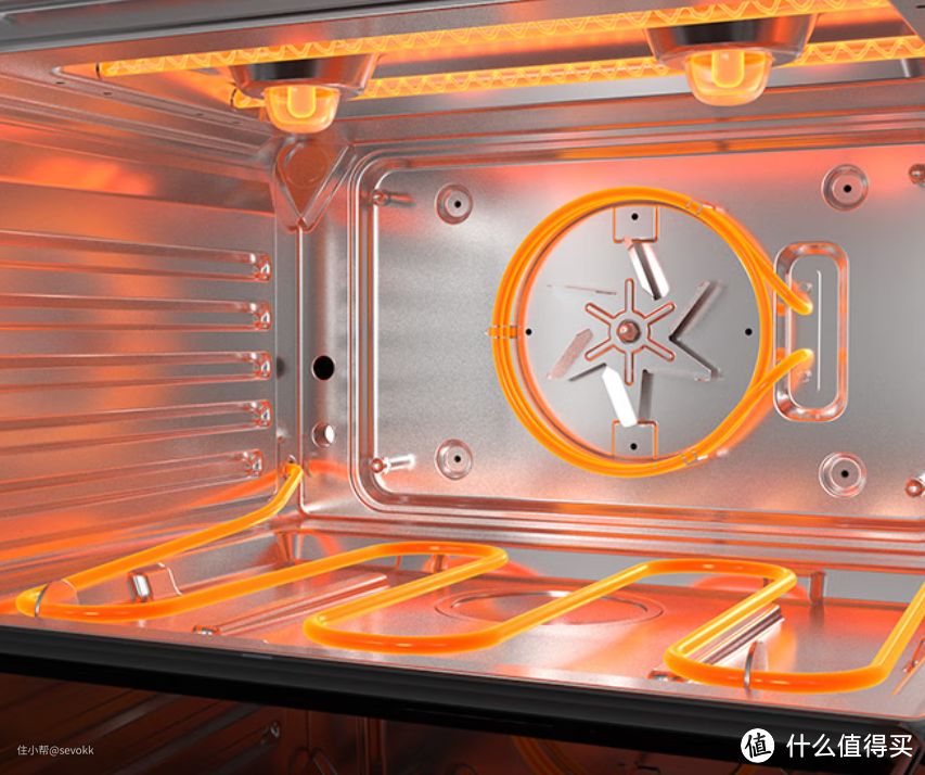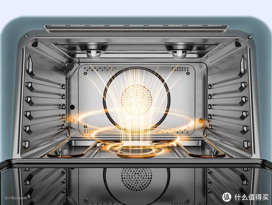 后部5维热风,动态平衡腔内温场,启动后热风循环加热,全方位热量渗透均匀烘烤,烘焙美食时上色也更加均匀,烤肉食、酥皮食物外焦里嫩、酥脆无比。所谓热风循环,可以理解为整个烤箱变成加大版的空气炸锅,风力大,热量更均匀,多层烘焙也不受限制。