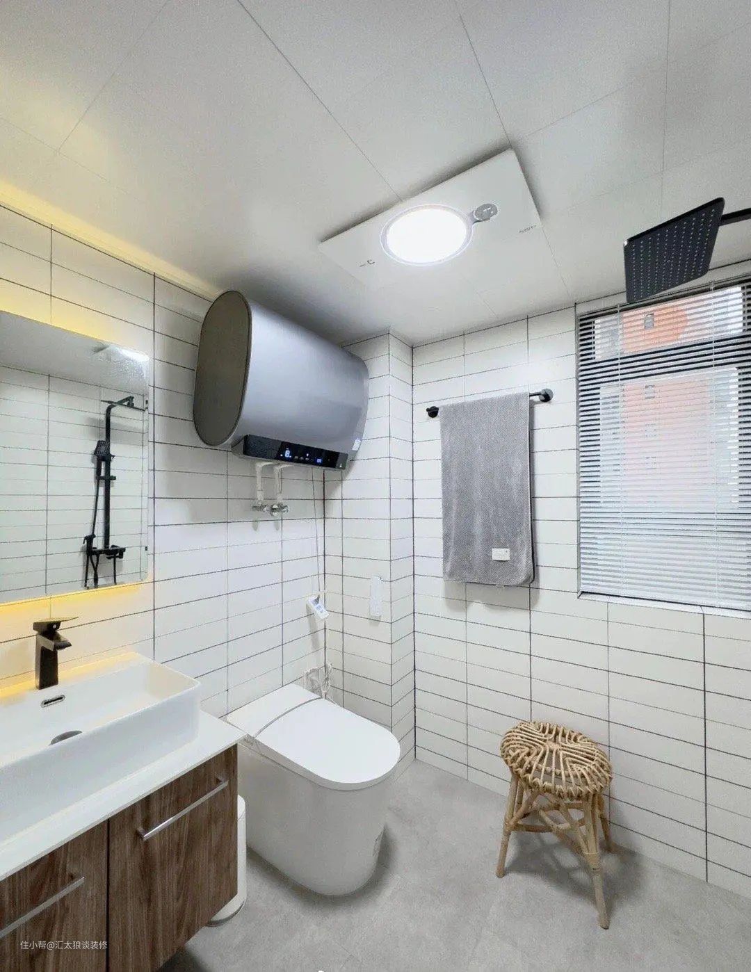 卫生间在过道左侧,室内装修采用白墙砖、灰地砖与木色的浴室柜相搭,朴素自然好打理。