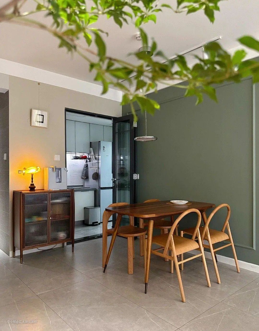 餐厅这边做了一面灰绿色的背景墙,与木色的餐桌椅和餐边柜搭配在一起,更能凸显清新自然的感觉。整个就餐区,虽然在硬装方面很简单,但通过屋主的一番软装布置,整体效果看起来还蛮有氛围感的。