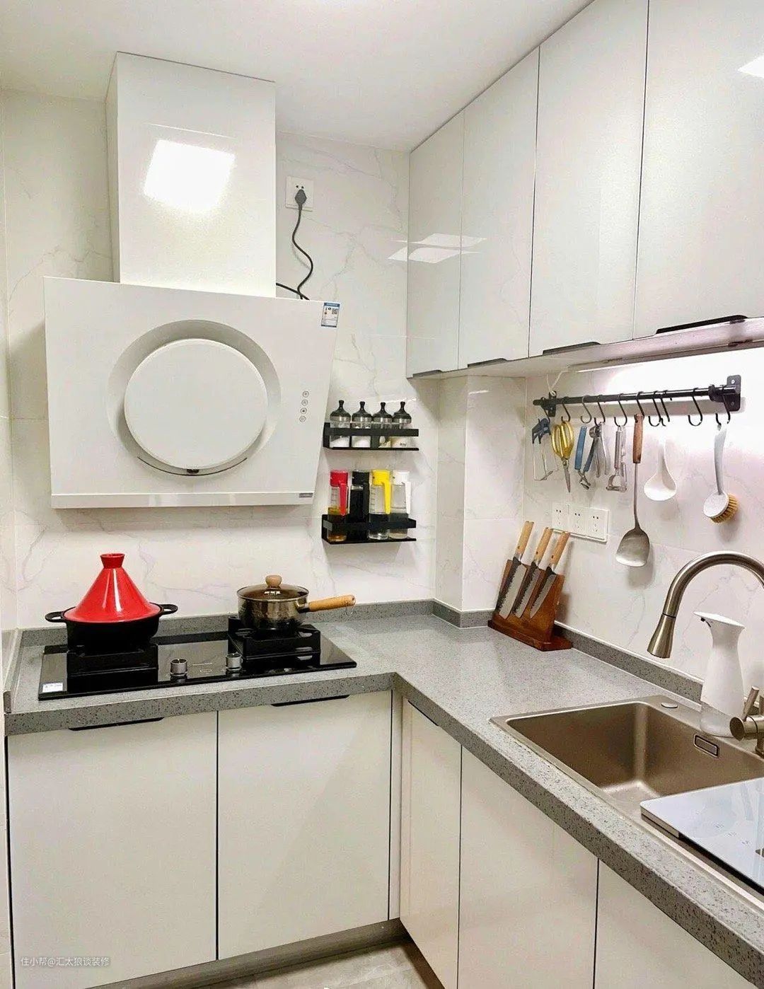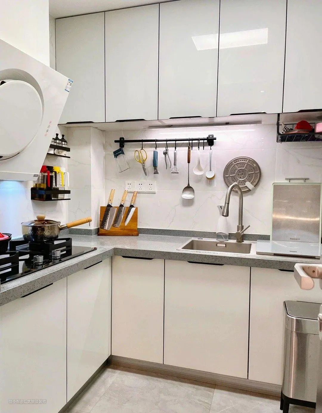 厨房这边,整体以白色与灰色相搭,虽算不上很惊艳,但看着也很清爽整洁。屋主充分利用墙面空间,将各种琐碎小物都收纳在了墙上,极大地解放了台面空间,视觉上也给人十分工整有序的印象。