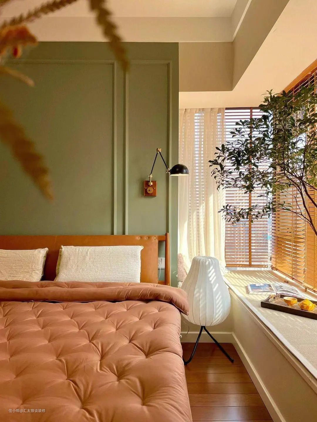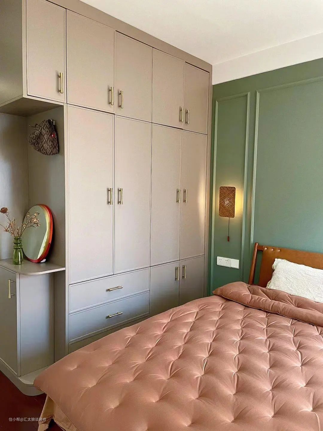 卧室的床头背景墙采用了莫兰迪绿,墙面上还饰有简约的装饰线条,搭配棕色床头靠背和灰色的衣柜,显得很淡雅清新。