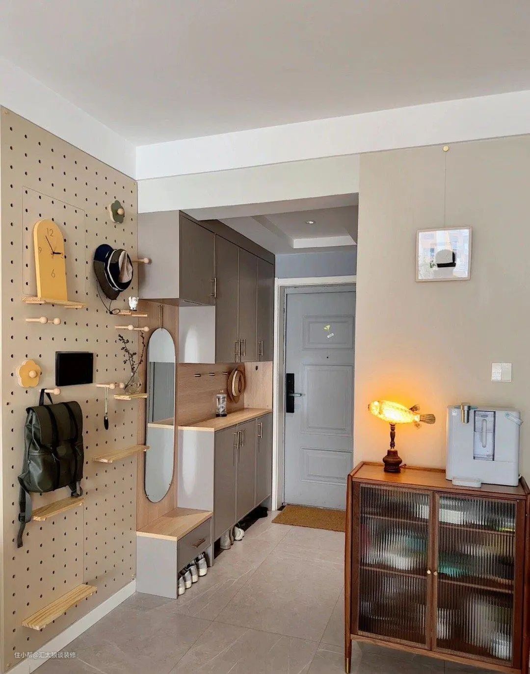 一进门,玄关右侧设有一组定制鞋柜,鞋柜的中部和底部都做了留空,方便放置经常要用到的东西,鞋柜旁边的墙上还装了一面洞洞板,可以根据需要,用作收纳或装饰,大大增加了实用性与美观性。