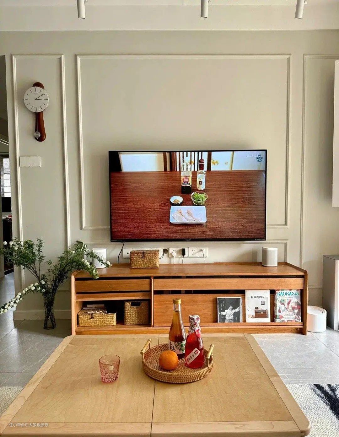电视背景墙这边,用石膏线条,做了简单的边框造型,为客厅区域的装修,增添了一点精致感,顶部还配了轨道射灯,晚上,灯光打下来,照在背景墙上,室内氛围很温馨。