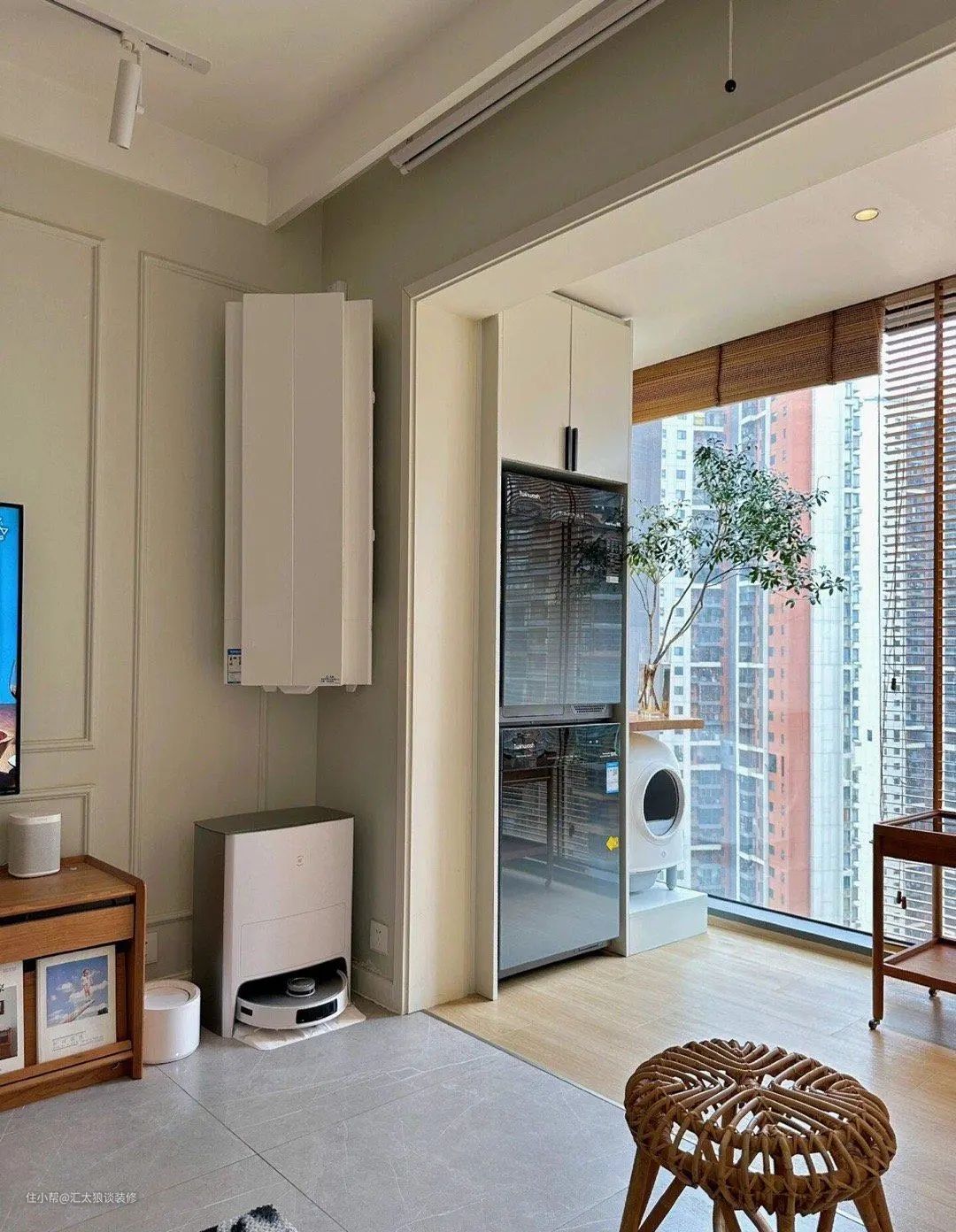 阳台两侧,一侧是休闲区,一侧是洗衣区。洗衣机和干衣机被屋主藏在了玻璃柜子里,平时几乎是隐形的,坐在休闲区时,望向对面,眼前不会有杂乱之感,生活也更有仪式感。