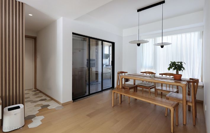 餐厅简洁通透且实用,没有花里胡哨的装修设计,简简单单耐看又舒适。简易造型的桌椅设计,温润的木质色调,带来更加自然的感受,整体占用面积少,视觉感更通透。飘窗的设计增添了生活趣味,成为居家休闲好场域。
