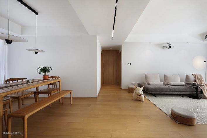 客餐厅连成一体,通过过道横梁进行区域划分,一道线性灯带设计,既实用又美观,照明效果也很不错。过道尽头是卫生间,做了隐形门设计,不仅风格更统一,也避免了入户对着卫生间的尴尬格局。