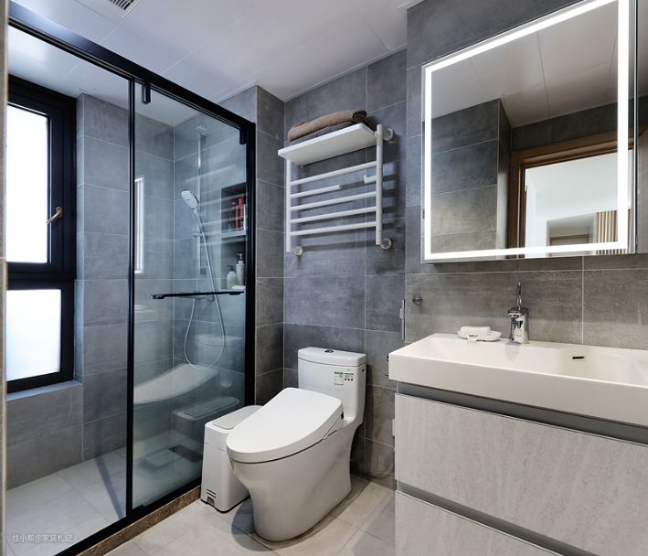 由于空间不允许,没能实现干湿两分离的卫生间设计,采用一体式的布局。虽然早晚高峰期使用有所影响,但整体效果还是可以的。灰色系瓷砖,搭配通透玻璃隔断,很好的平衡了空间。