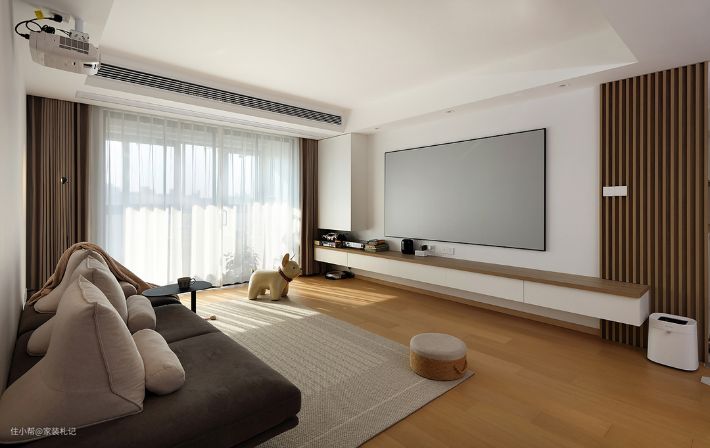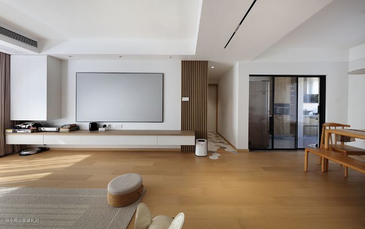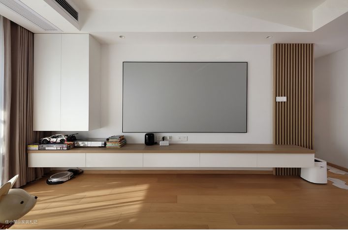 客厅采用原木色地板通铺,增加空间自然温度,同时搭配北欧元素的电视柜,让整个空间极具现代感。悬浮电视柜设计,减轻了柜体体量,让视觉感受更轻盈,也方便日常扫地机器人工作。