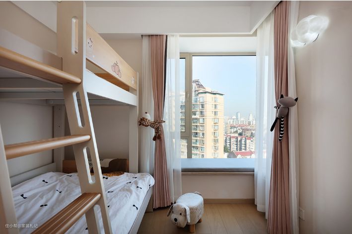 次卧依旧是简洁格调,浅色系的运用,让空间透着一股温馨。高低床设计,提高了空间利用率以及日常实用性。