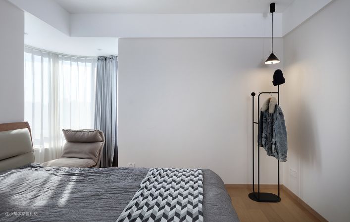 主卧没有复杂的造型和装饰,一切简简单单,由于拥有独立衣帽间,睡眠区并没有在设计衣柜,而且利用衣架做简易收纳,占用面积少,实用性高。弧形小阳台,布置上懒人沙发,成为一处休闲空间。