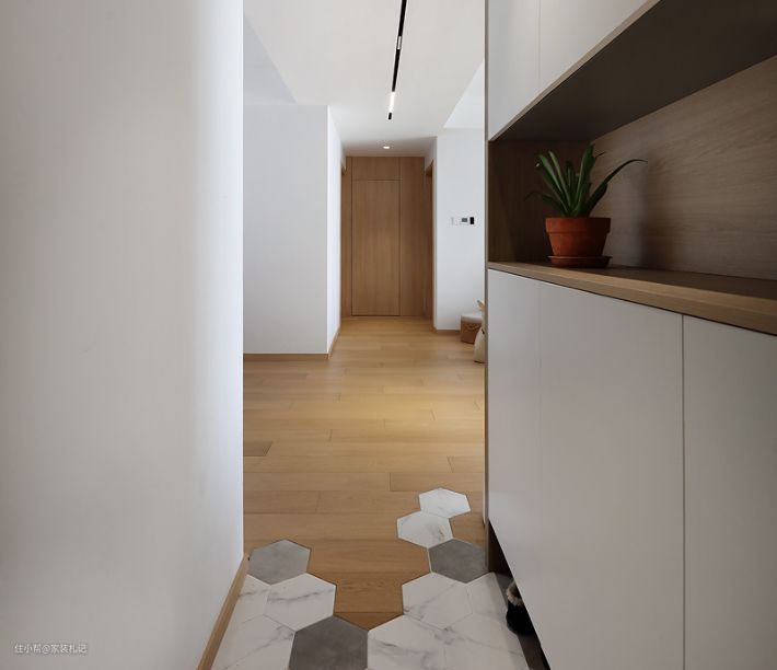 玄关没有堆砌式装修,仅设计了悬空鞋柜,增加收纳空间同时提高实用性。鉴于玄关区域特性,特意挑选六边形地砖铺叙,灰白两色搭配告别单一视觉感受,空间活泼不沉闷。地砖与地板交界处,特意做了处理,让整体过渡自然,效果更美观。
